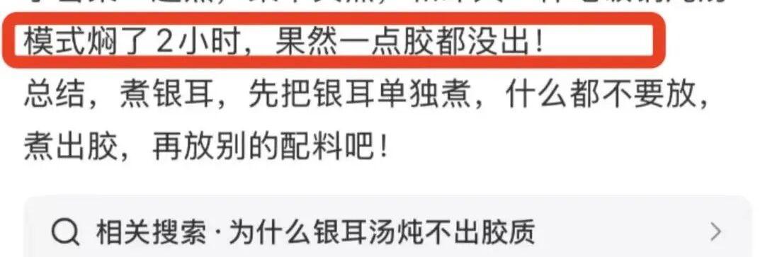把“銀耳熬好”,甚至被大家吐槽全靠運氣,泡發-清洗-處理銀耳都要1個小時+起步的。火大了煮得急,就是熬幹了也不會好喫;火候小了又釋放不出來多糖,翻看某書,光是討論煮銀耳就要10w+的話題度。