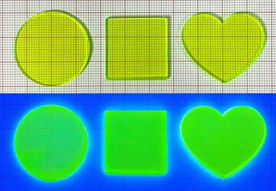 形狀可控的透明閃爍屏,上行爲日光照射,下行爲紫外光照射(圖片來源:《自然 通訊》)