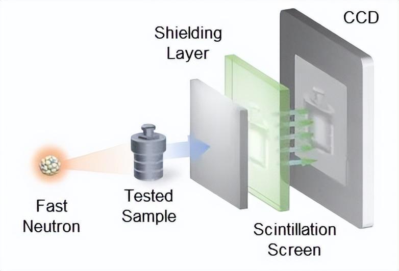 在快中子成像系統中,閃爍屏同樣充當“翻譯官”的角色。快中子穿過被檢測物體,攜帶着物體內部結構信息,撞擊到閃爍屏上。閃爍屏裏的特殊物質(通常是氫含量豐富的)受到中子撞擊後,會產生高速運動的質子(反衝質子),這些質子再把能量沉積到閃爍屏中的發光中心,最終激發出可見光。這些可見光被相機捕捉,就形成了我們看到的圖像。