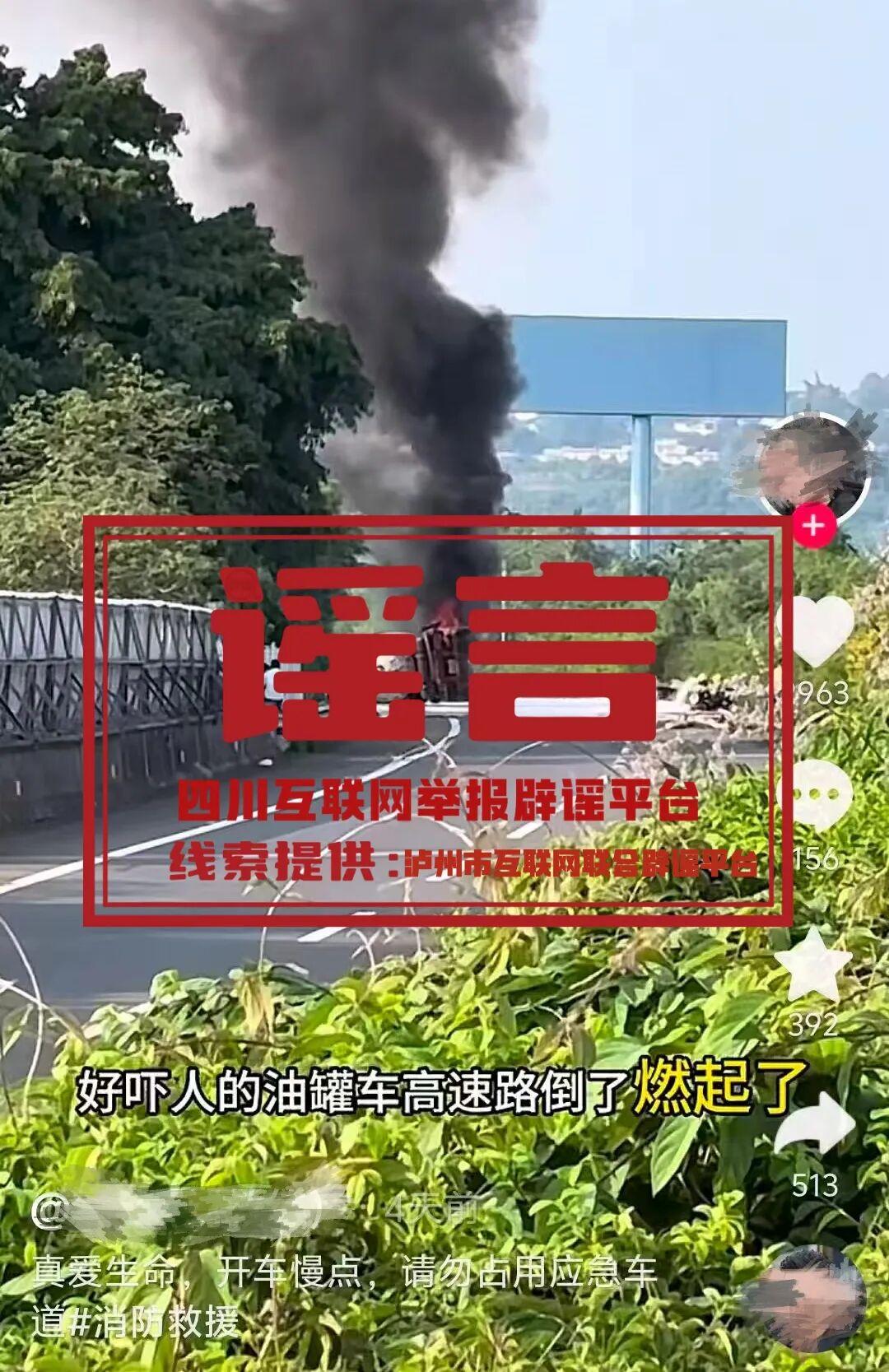 近日,有網友在社交平臺發視頻並稱“瀘州繞城高速路油罐車倒了爆炸,燃起了”。