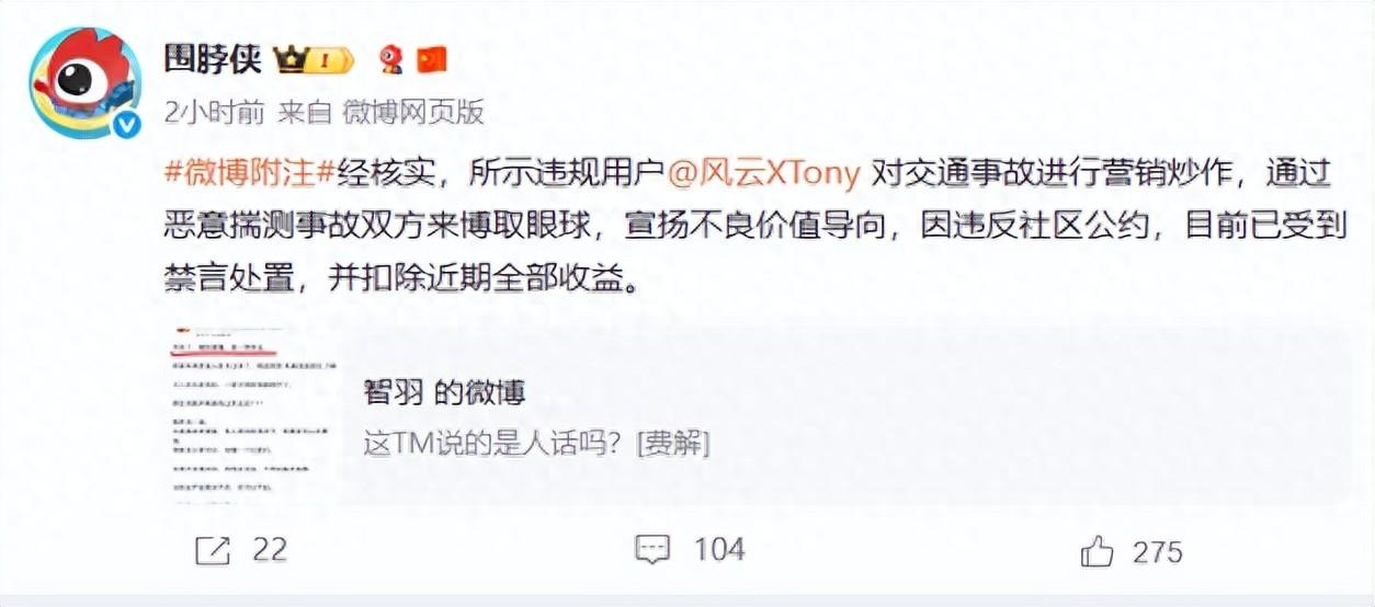 10月9日,微博社區觀察員官方賬號@圍脖俠 發佈消息稱,用戶@風雲XTony 對交通事故進行營銷炒作,通過惡意揣測事故雙方來博取眼球,宣揚不良价值導向,違反社區公約,目前已受到禁言處置,並扣除近期全部收益。