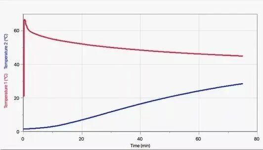 因爲我知道水的比熱容,所以可以用水溫降低了多少來算出火雞熱能的增加。下面是一張變溫曲線圖(證明我真的算過)。