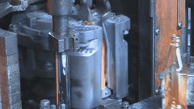 玻璃瓶流水線上,被機器拉出來的玻璃胚,會落在底部有凸起的模具上丨youtube/New Age Media - video production