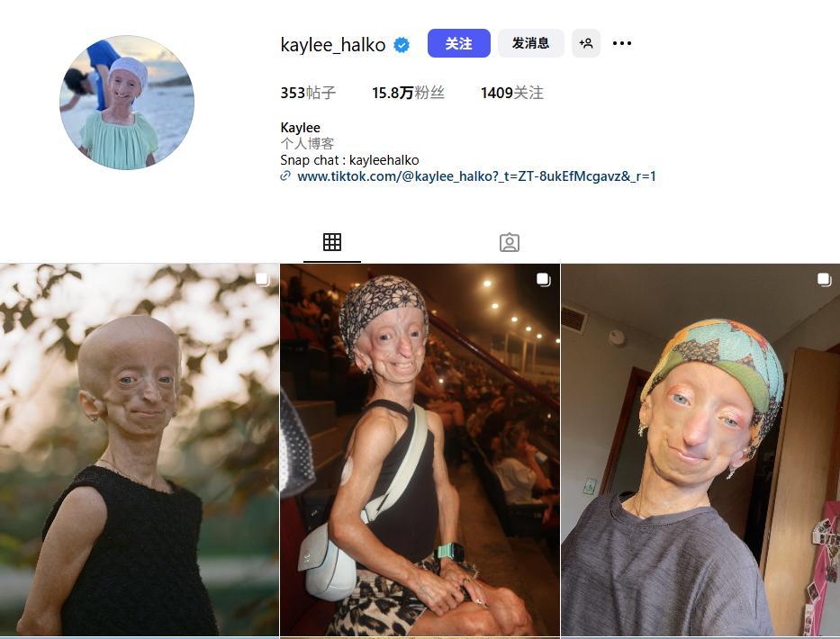 2003年出生的凱莉·哈爾科(Kaylee Halko)也是一名早老症患者,因爲勇敢地在社交媒體分享自己的病情與生活,收穫了15.8萬個粉絲。