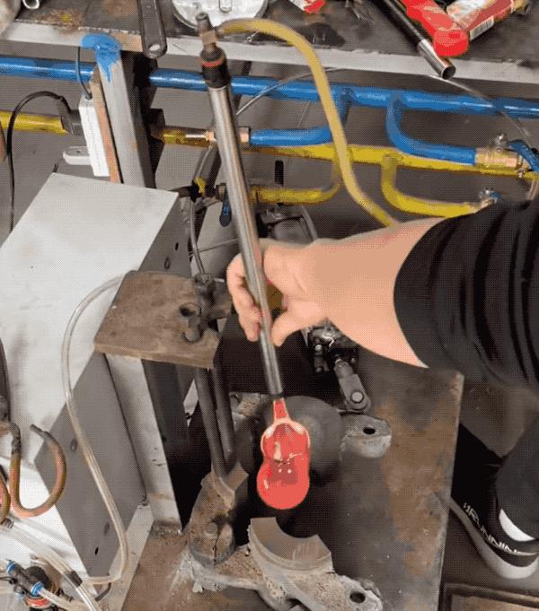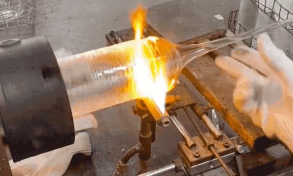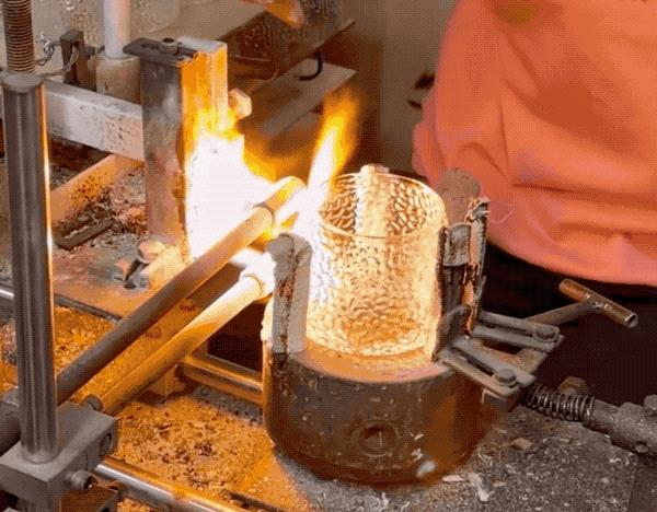 下圖是把玻璃燒到半軟,一端連着氣吹,軟塌塌的玻璃被吹鼓起,緊貼着凹凸不平的模具表面,就服帖地做出錘紋效果了。