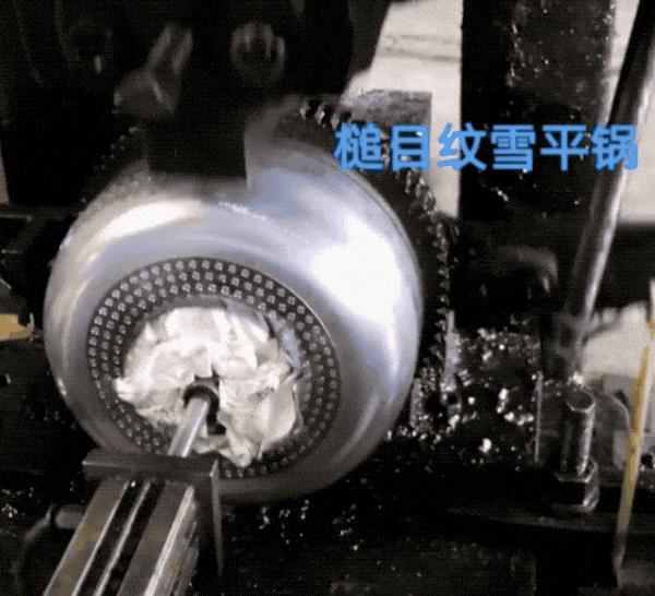 一種方法和之前做壓紋杯具一樣,把鍋具套在有紋路的模具上,給鍋具的內外都硬生生擠壓出片片雪花紋得效果。