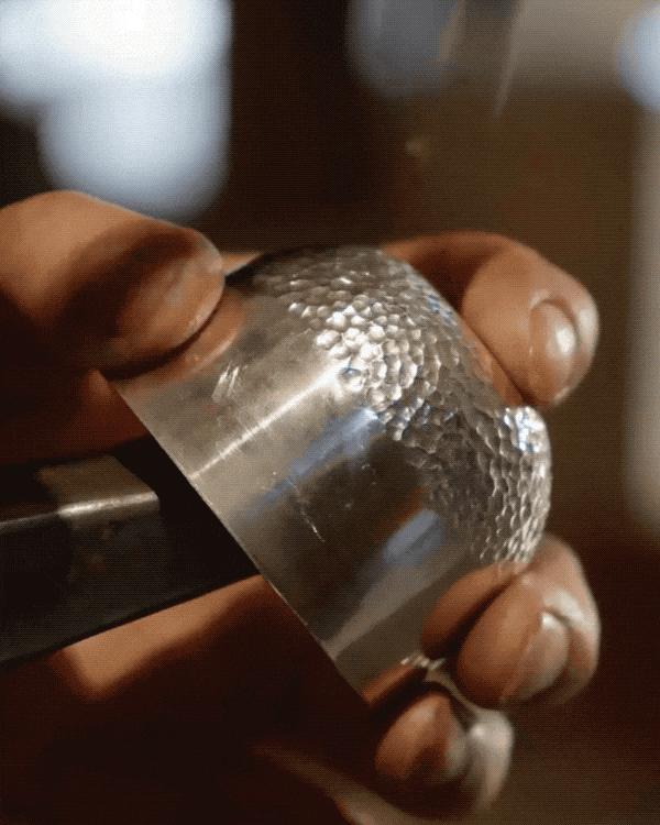 這種利用錘子或專門的工具在金屬表面反覆敲擊,形成細密或規律的凹凸紋理,從而產生獨特光影效果和裝飾感的操作,就是“錘紋工藝”了。