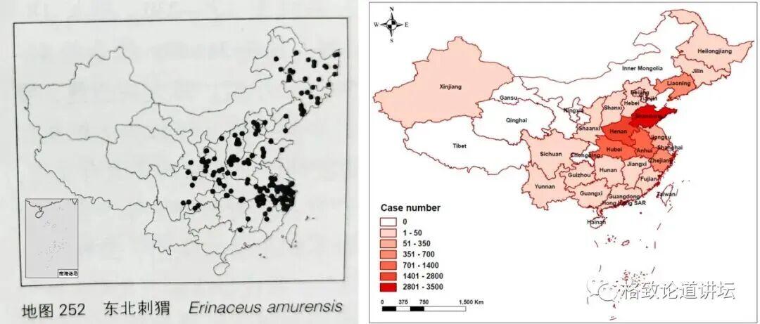 我們來看,東北刺蝟的分佈跟右面病例的分佈,就是那個深色的區域,是不是基本上吻合?