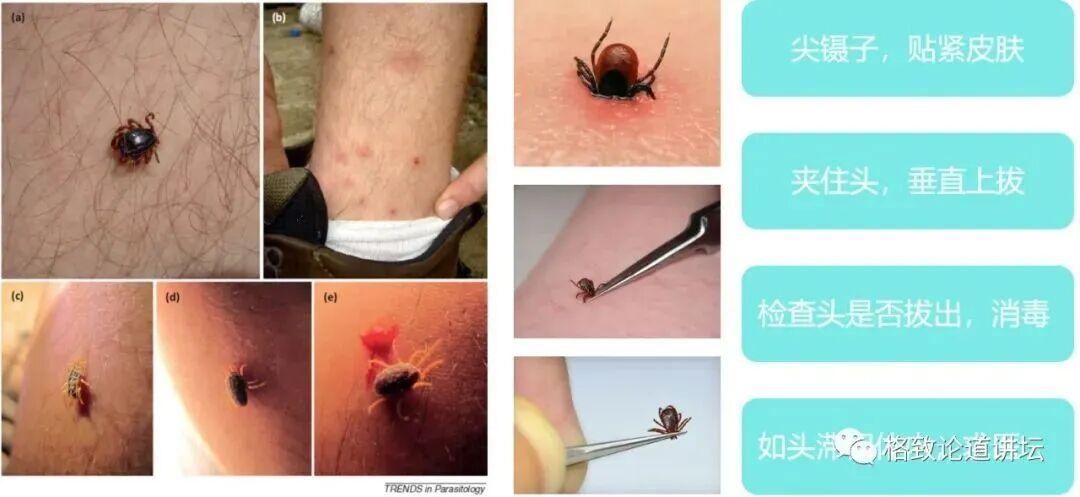 還有一個重要問題,如果你被蜱蟲叮了怎麼辦?蜱蟲一般在哪裏叮?平常撓不到的地方,比如膝蓋的後面、腰部、腹股溝、腋窩,還有什麼發跡線、耳朵後面這些地方。如果你發現以前皮膚白白淨淨,忽然多了一個痣或者一個痦子,那就得小心一點了。