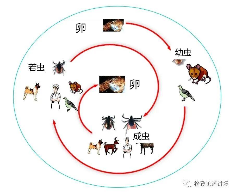 它的生活史實際上非常複雜。它從卵孵化成幼蟲,幼蟲一般在小動物上吸血,像老鼠、小鳥什麼的。吸完血之後再蛻皮變成若蟲,若蟲可以在小動物上吸血、也可以在大動物上吸血。再蛻皮之後變成成蟲,通常都在大動物上吸血了,包括我們人,然後它會去產卵。