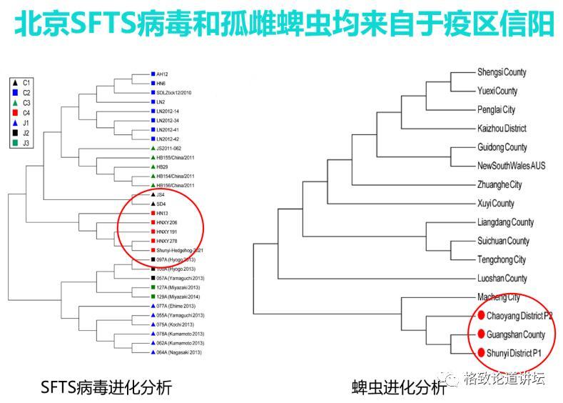 我們把這個蜱蟲還有病毒的序列進行了進化分析,發現在順義發現的病毒序列實際上跟河南信陽的病毒序列最接近,而順義和朝陽的蜱蟲序列最接近的也是河南信陽光山縣的。