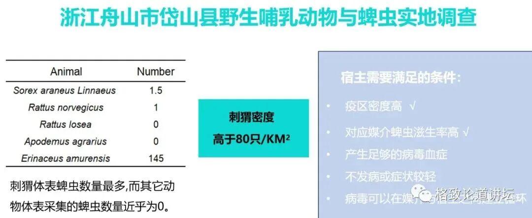 爲了進一步證實,我們計算了它的密度。刺蝟在舟山岱山島密度很高,可以到80只/平方千米以上,另外它體表的蜱蟲很多,平均每個有145個蜱蟲。而其他動物像什麼老鼠、鼩鼱,有的有一個,有的壓根兒就沒有。後來我們在全國其他疫區也做了調查,基本刺蝟的密度都是大於100只/平方千米。這就滿足了宿主的前兩個條件。