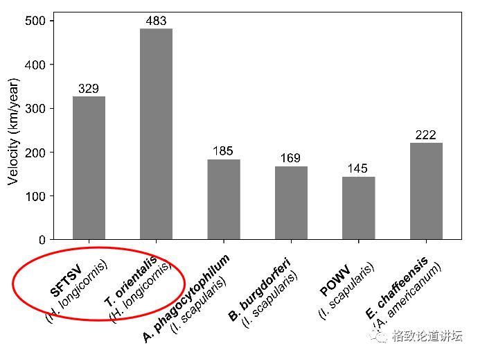 首先我們比較了一下兩個病原,一個是發熱伴,另一個病原是也是長角血蜱傳播的,是一種寄生蟲叫東方泰勒蟲。發現長角血蜱傳播病原的速度遠快於其他一些蜱蟲。