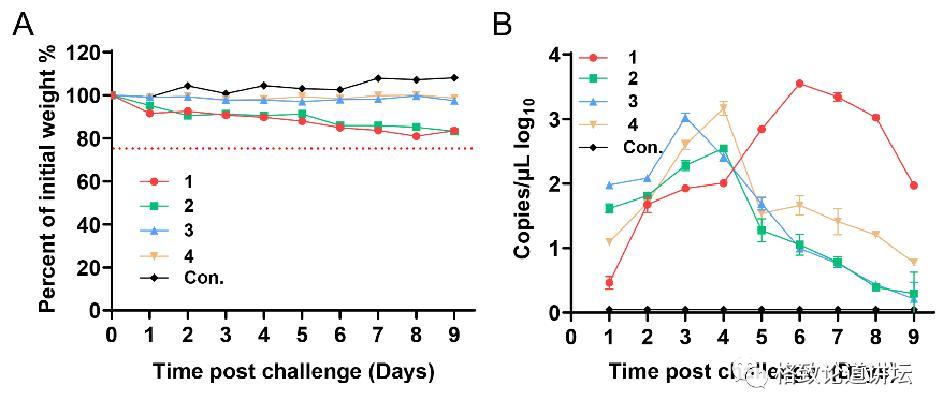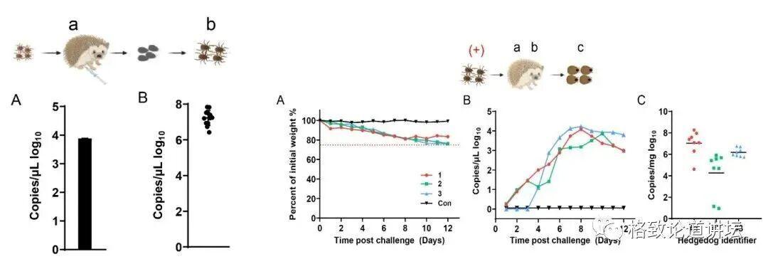 那我們就做下一個實驗,看刺蝟能不能產生病毒血症,血裏面有沒有病毒。我們通過腹腔注射或者皮下注射給刺蝟接上毒,發現它的體重並沒有什麼下降,但是它的血裏產生了很多這個病毒。