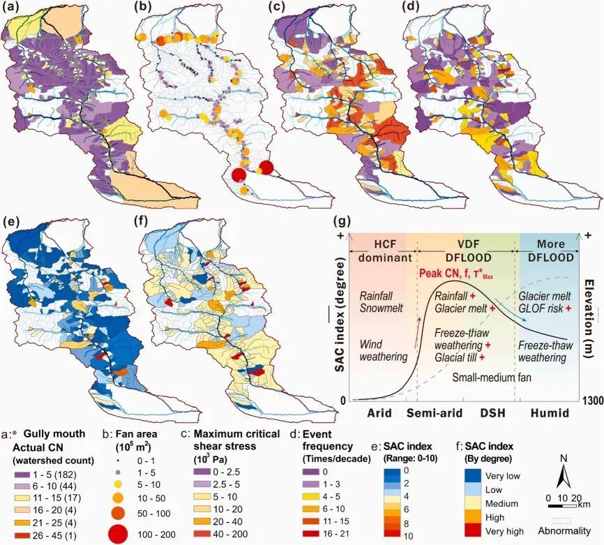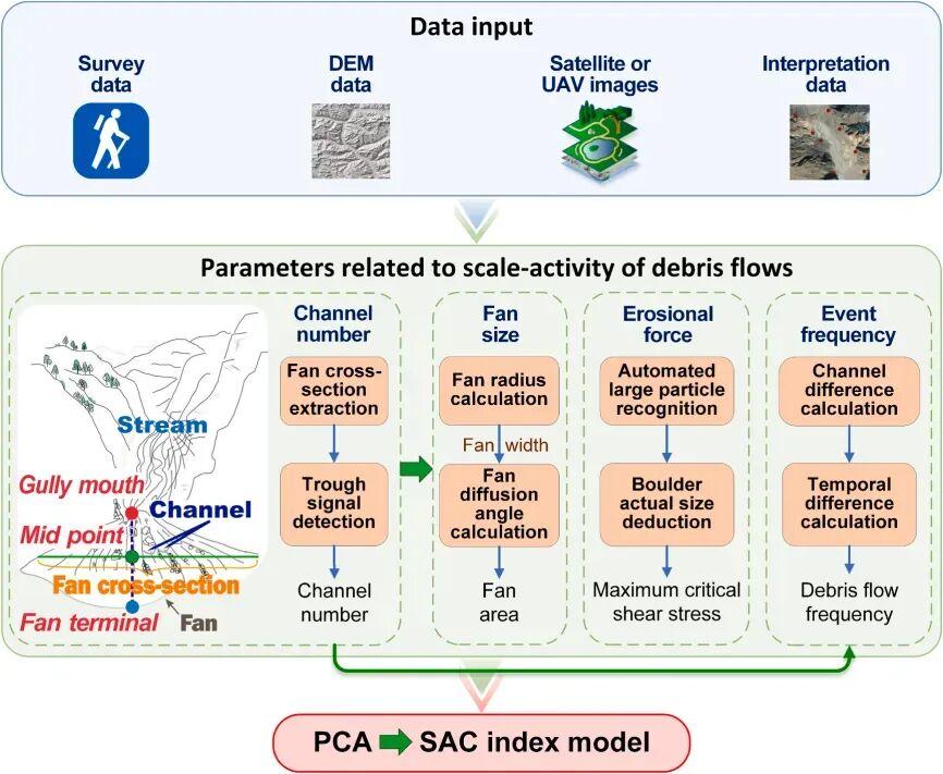在此基礎上,該團隊構建了“規模-活動性複合指數(SAC)”,用於量化泥石流的活動程度。SAC 指數綜合考慮了泥石流的規模和頻率兩個方面,通過主成分分析方法將多個泥石流活動性關鍵參數(包括溝道數量、扇體大小、最大臨界剪切應力和事件頻率等)集成到一個指數中,能夠全面反映泥石流的活動特徵和潛在危害。