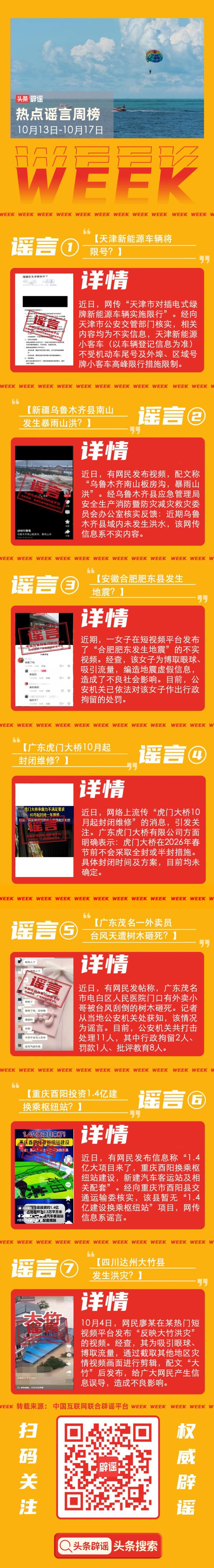此外,本週還有“新疆烏魯木齊縣南山發生暴雨山洪”、“‘安徽合肥肥東縣發生地震”、“廣東虎門大橋10月起封閉維修”等不實消息流傳。