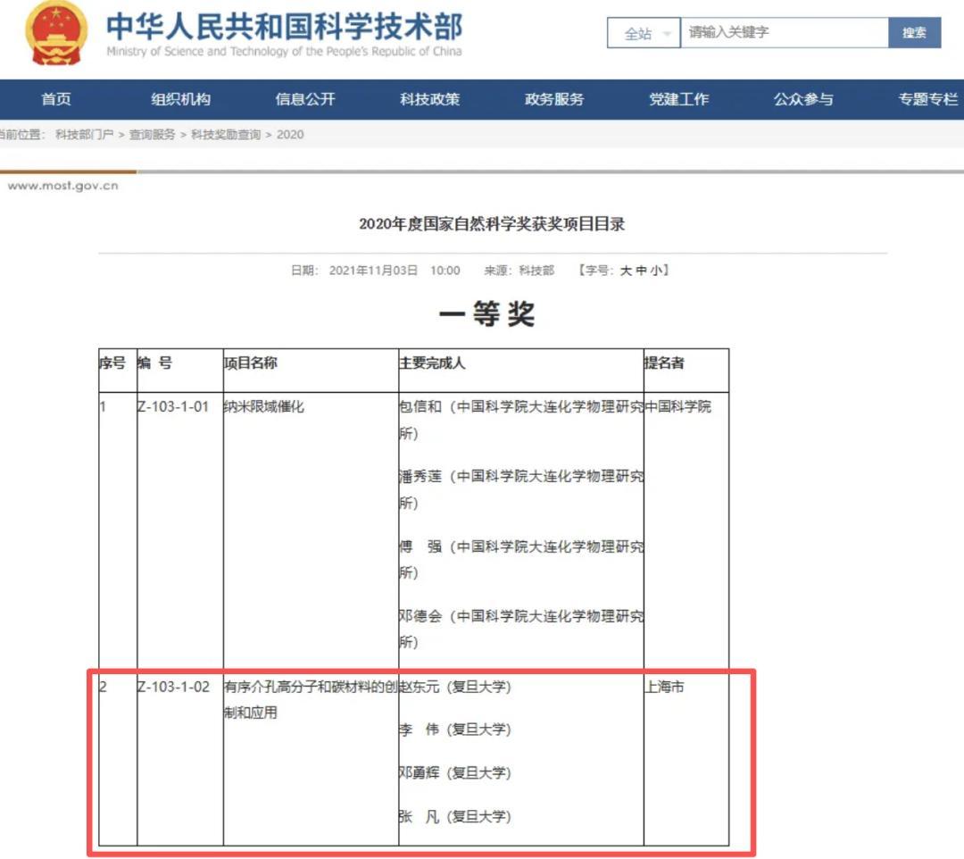 在2020年,復旦大學趙東元院士團隊,憑藉《有序介孔高分子和碳材料的創制和應用》,一舉斬獲2020年度國家自然科學獎一等獎。