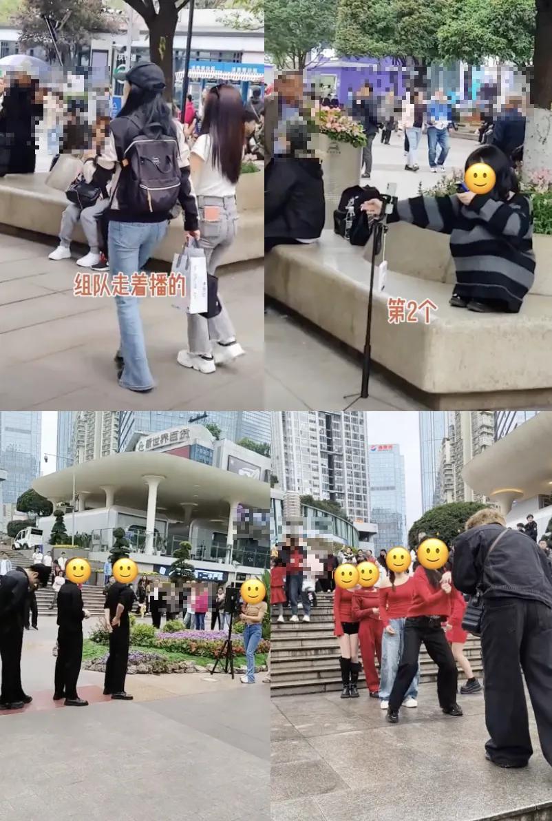 主播一邊表演才藝,一邊將鏡頭肆意掃向過往的行人,屏幕內的觀衆則藉此對着路人的穿着、樣貌、身材乃至同行者關係,進行肆意地點評與打分。