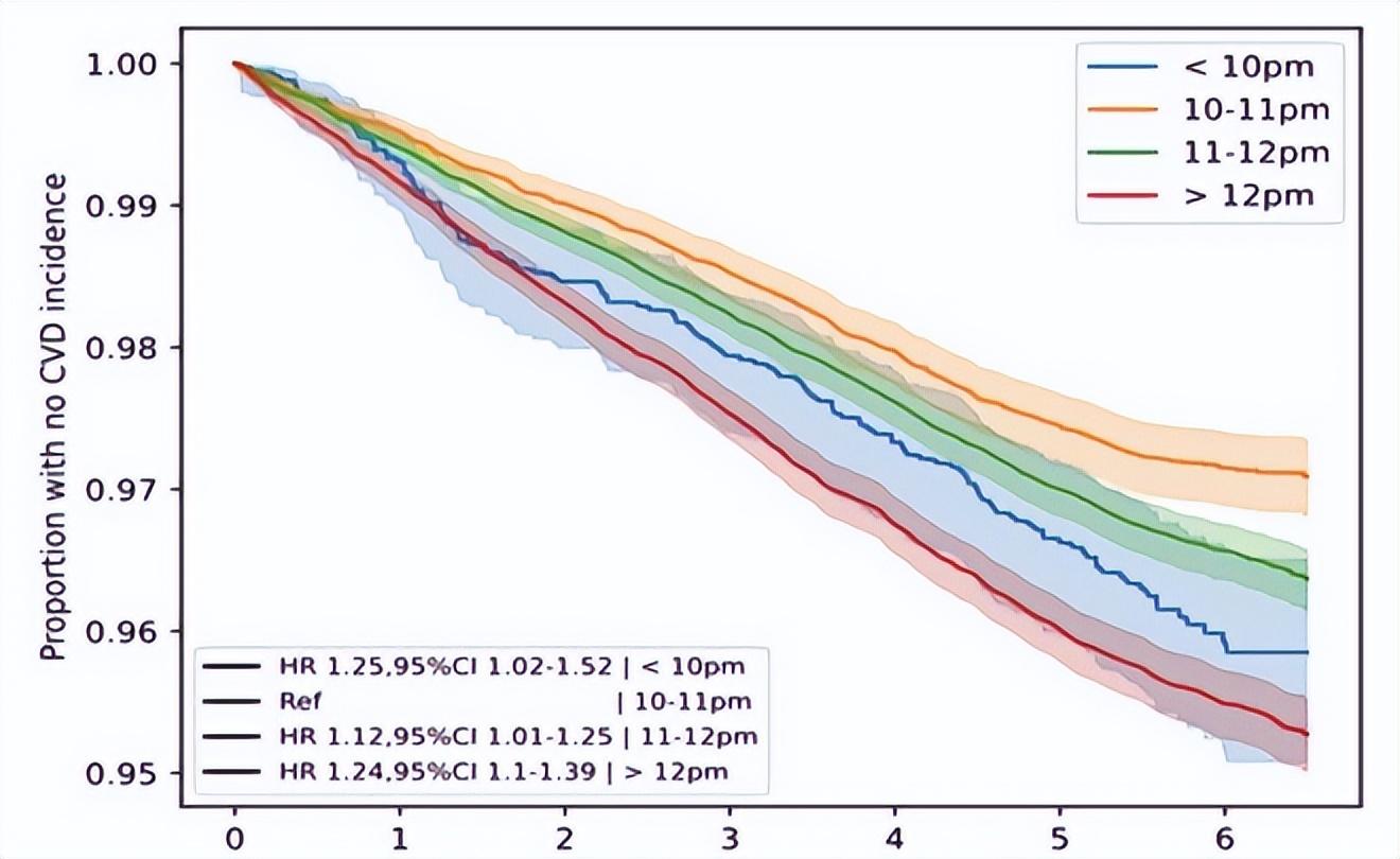 研究人員把這些人分成四組:晚上 10:00 前入睡、晚上 10:00~10:59 入睡、晚上 11:00~11:59 入睡和午夜後才入睡。然後,他們對參與者進行了平均 5.7 年的隨訪,統計誰在這段時間裏新發了心血管疾病(如心梗、中風、心衰等)。