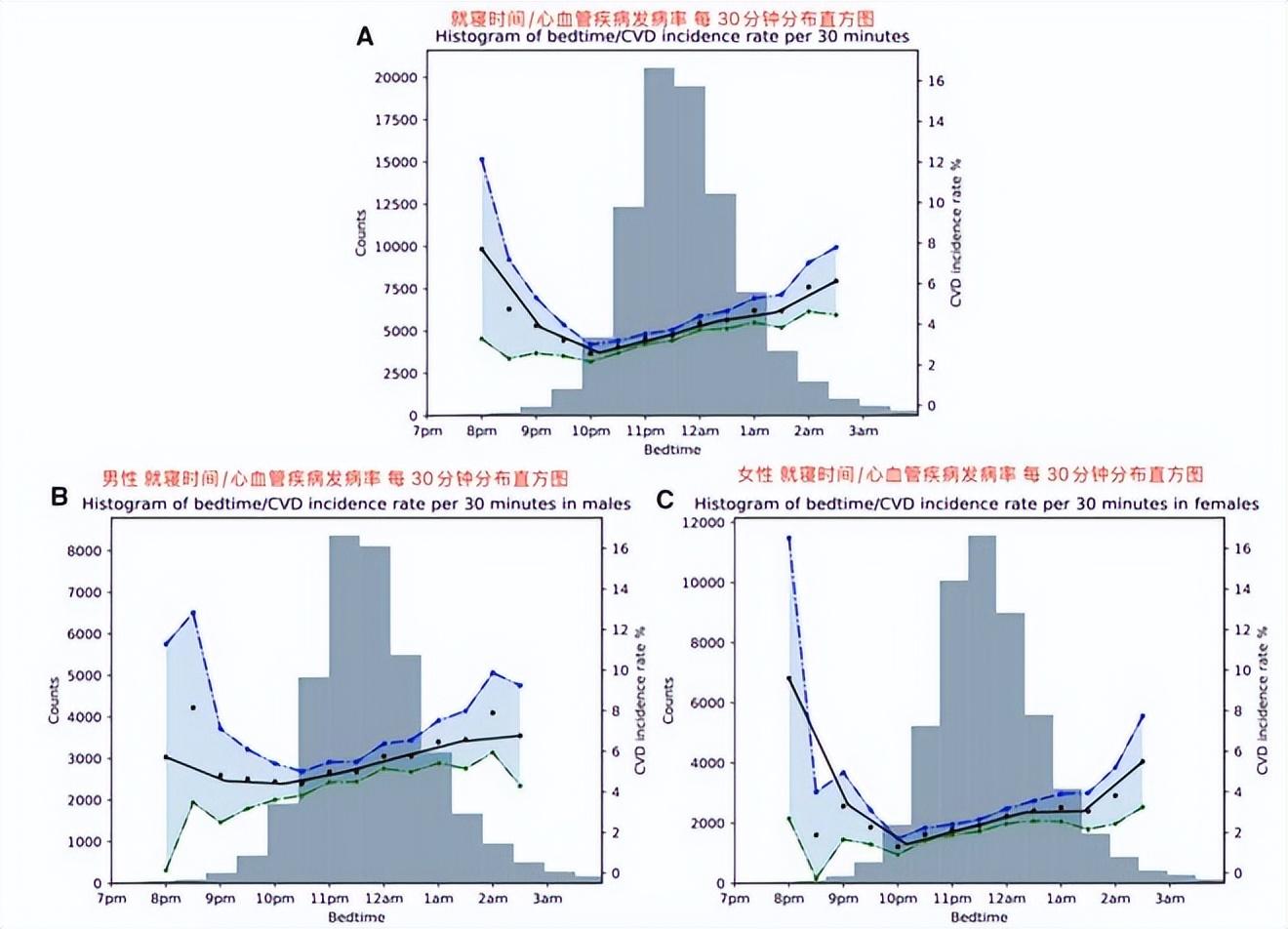 睡眠開始時間與心血管疾病發病率之間的關係,(A)總體樣本,(B)男性,(C)女性,圖源:參考文獻 [1]