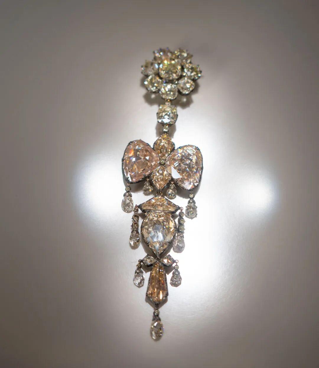 這件蝴蝶結形胸衣飾品,是19世紀最令人印象深刻的飾品之一。它共鑲嵌2634顆鑽石,高22.2釐米寬10.5釐米,比一個巴掌還大。它雖沉重卻不堅硬,精湛的鑲嵌工藝賦予蝴蝶結和流蘇極大的柔韌性,使寶石在輕微的擺動中熠熠生輝。