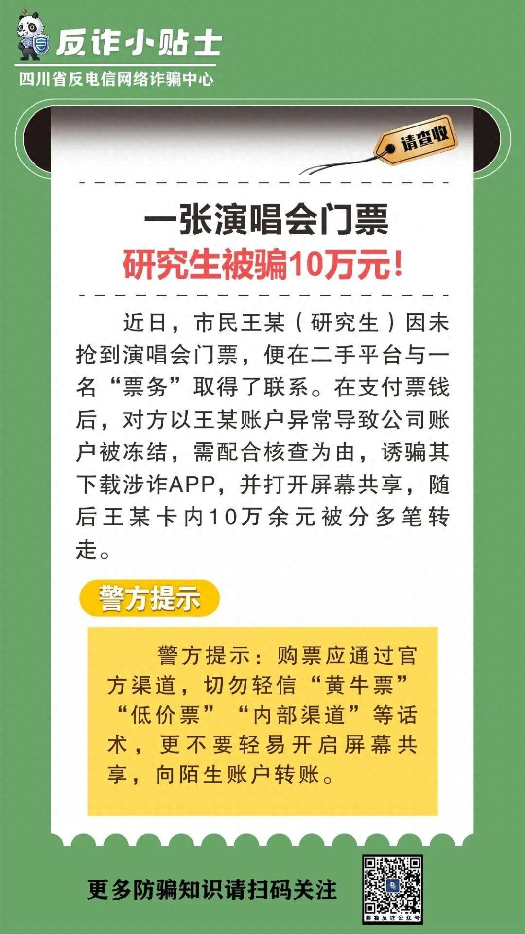 近日,市民王某(研究生)因未搶到演唱會門票,便在二手平臺與一名“票務”取得了聯繫。在支付票錢後,對方以王某賬戶異常導致公司賬戶被凍結,需配合覈查爲由,誘騙其下載涉詐APP,並打開屏幕共享,隨後王某卡內10萬餘元被分多筆轉走。