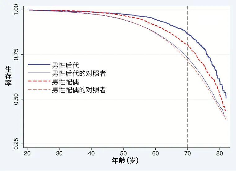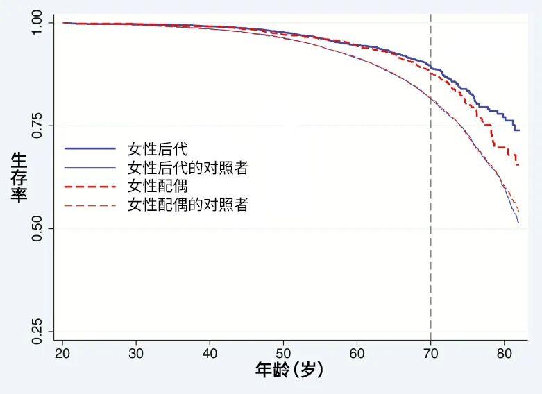 嫁娶進長壽家族的男性和女性,生存率均在普通人與長壽者子女之間(紅色粗虛線) | 參考文獻[1]