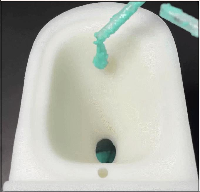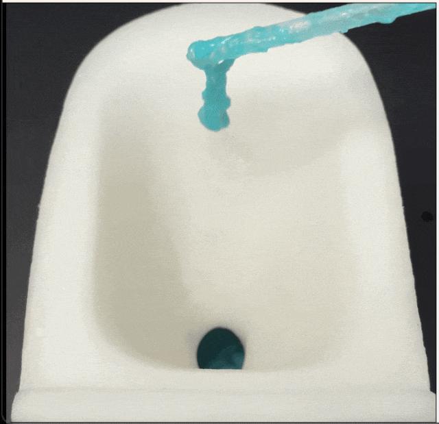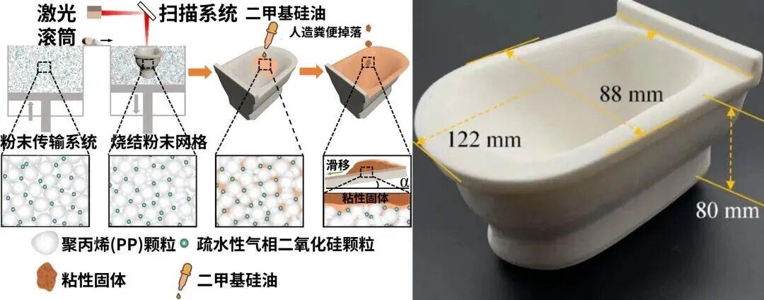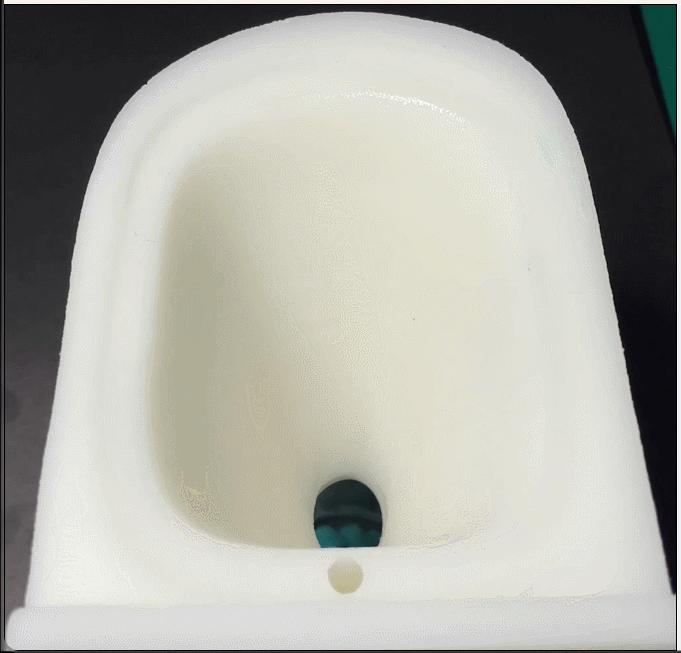 他們用95:5的複合聚丙烯和疏水性氣相二氧化硅顆粒作爲原料,做了一個8釐米高的迷你馬桶。這裏用到了一種燒結溫度不是很高的3D打印技術,好讓材料內部、打印的層與層之間,都有大量的微米級縫隙。