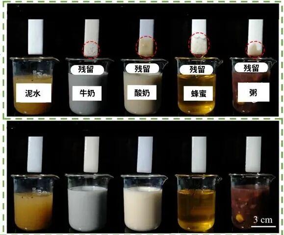作爲對比,先來看看不填充潤滑劑(上圖)和填充潤滑劑(下圖)的條件下,相同材料在浸泡不同粘性液體後的掛壁情況丨參考資料[3]
