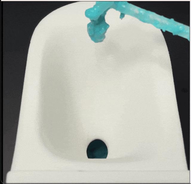 第二步,把模擬糞便甩在上了潤滑劑的豬籠草馬桶上。只見藍便便從馬桶邊緣流暢地滑移到了下水道,都不需要用水衝,馬桶壁上一點殘留都沒有!