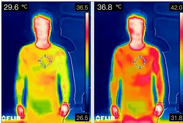 穿上之後,通過熱能成像圖我們能清清楚楚地看見,這自發熱能力真的是強!