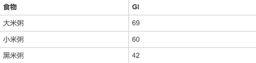 根據悉尼大學發佈的《國際血糖指數和血糖負荷值表(2008 版)》,大米飯(白米)的 GI 值約爲 73,屬於高 GI 食物。而用同樣的大米熬成的粥,其 GI 值更是高達 78。 有的實驗室測定,米粥產生的 GI 值甚至可以高達 87,顯著高於米飯[3]。