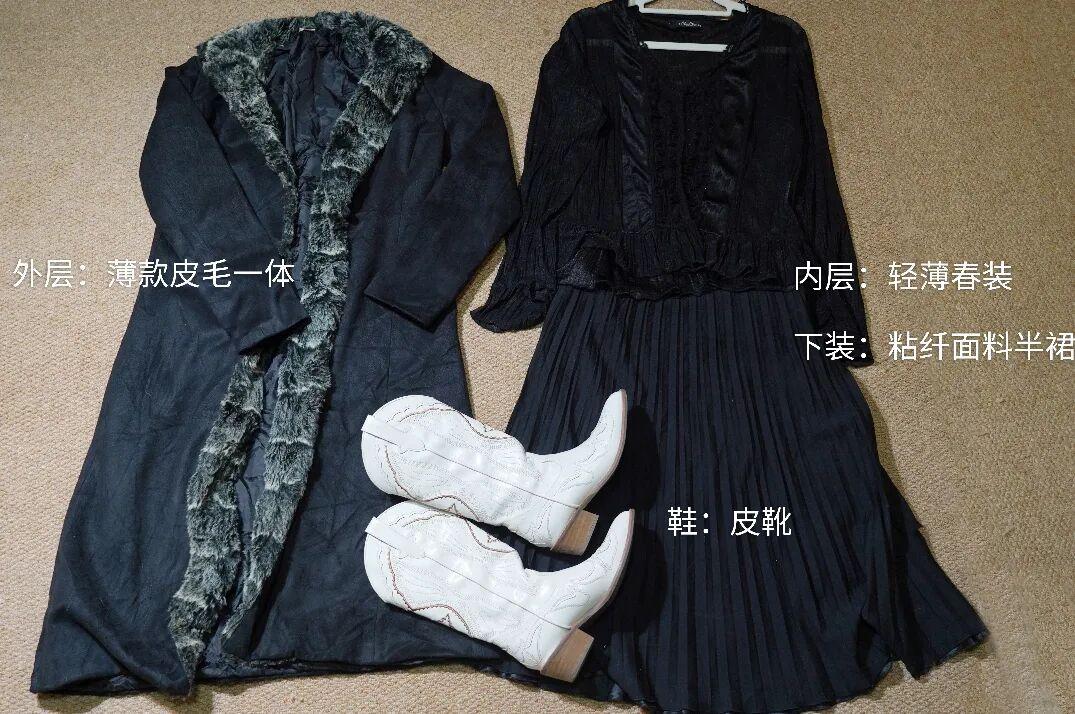 女士:長款羊毛大衣+超薄款羽絨服(充絨量30g左右)+長袖春裝(只要材質合適,什麼都行)