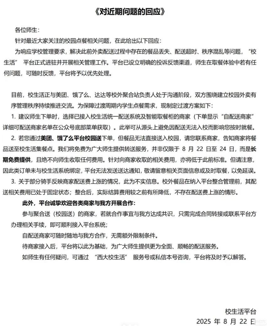 校方回應,引入“校生活”,是爲了解決學校師生強烈反應的校園外賣亂放、錯拿、丟失等問題。早在去年,就有西南大學的學生在社交媒體上抱怨“外賣進校40分鐘了還沒送到手上”。