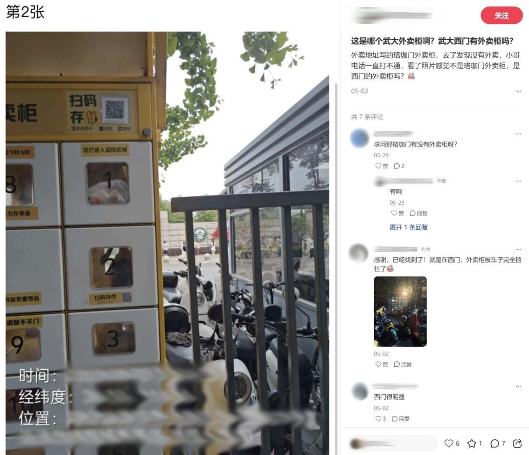 學生們的困擾首先是,我的外賣到底在哪裏。學校太大,校門太多,騎手找不到學生描述的地址,學生找不到騎手放外賣的地方,常常只能對着騎手拍來的外賣照片滿校園尋寶——“這到底是東門還是西門的外賣櫃?”
