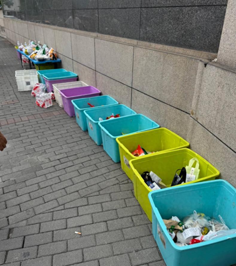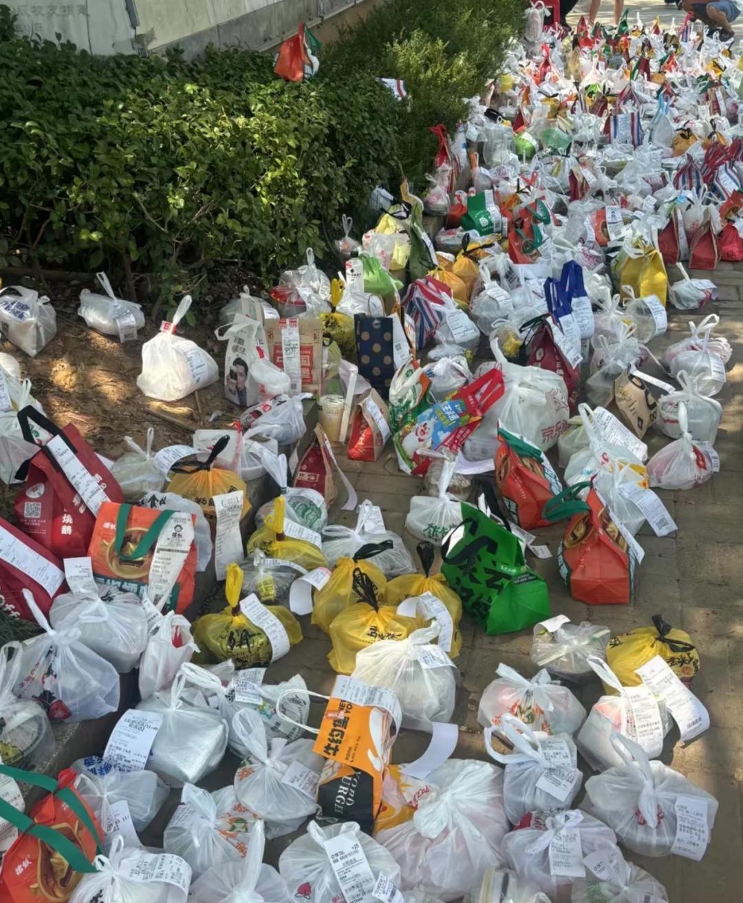 當天校內外賣配送中斷,校門口出現了短暫的混亂。學生拍攝的圖片裏,進不來學校的外賣被隨意堆放在校門口的一排塑料箱裏。