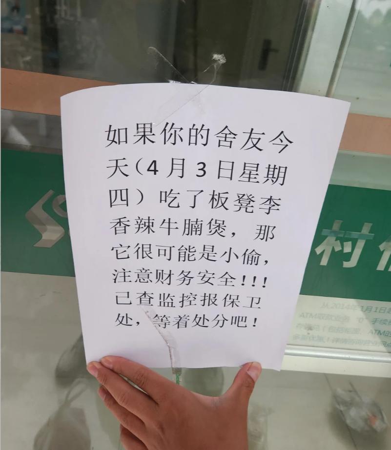 一份外賣二三十塊,大多數學生選擇不了了之,即使找到了偷外賣的人,也大多終結於一句“拿錯了”。於是大學生入學第一課是《沒外賣櫃如何守住午飯》,高年級學生則使出各種招數捍衛自己的外賣,包括釣魚執法、蹲守抓捕、監控查證、標語威脅。
