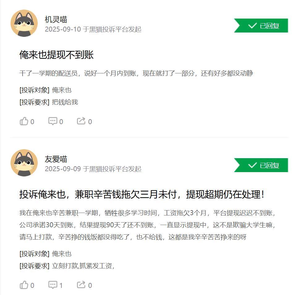 比如覆蓋了300多所大學的App俺來也,通過和高校達成3-5年獨家協議成爲了不少學校的“唯一指定外賣平臺”。和美團等用專業騎手送餐不同,俺來也主要招募校內學生兼職來跑腿送外賣,學生既是用戶也是騎手。但去年,多名在校學生在黑貓投訴平臺發聲,稱“平臺已拖欠超2個月薪資”。