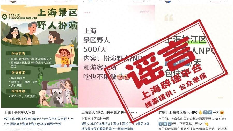 上海闢謠平臺調查發現,佘山國家森林公園之所以發佈這一消息,是因爲在社交平臺出現不少帖子稱,公園正在招人演野人。相關帖子還表示,入職要求不高,只要熟悉公園,能與遊客互動即可,“日薪日結”。但進一步覈查發現,這類招聘信息均來自個人賬號,對方無法提供招聘依據。