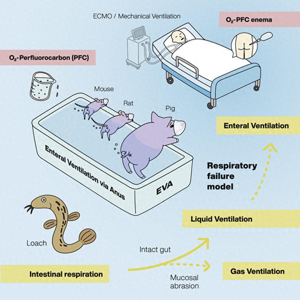 受到自然界動物們屁股呼吸的啓發。日本武部貴則(Takanori Takebe)團隊開始在哺乳動物身上進行屁股呼吸試驗。在一項研究中,他們進行了兩輪實驗,一次是直接向直腸通氧氣,一次是向直腸灌注富含氧氣的全氟萘烷液體。