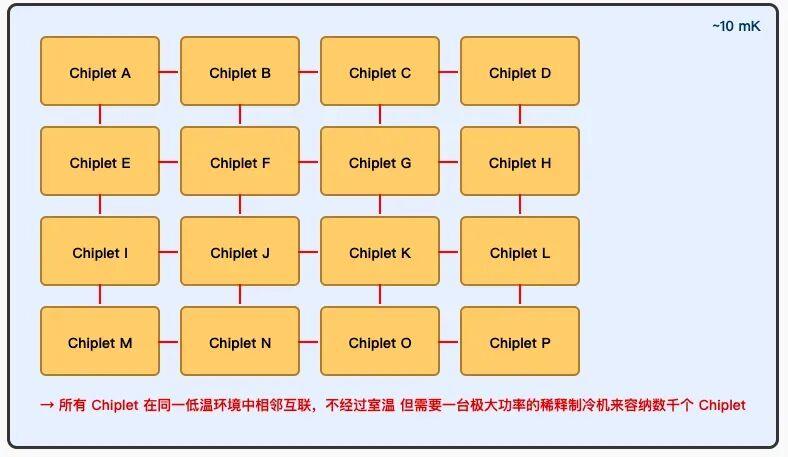 多個 Chiplet 被放置在同一稀釋製冷機內,並在低溫環境下直接互聯。這種集中式方案意味着需要一臺超大功率的稀釋製冷機 來容納並維持大量 Chiplet 的工作溫度。需要注意的是,實際的互聯拓撲並不一定是相鄰 Chiplet 兩兩直接連接,圖中所示的相鄰互聯方式僅用於演示。