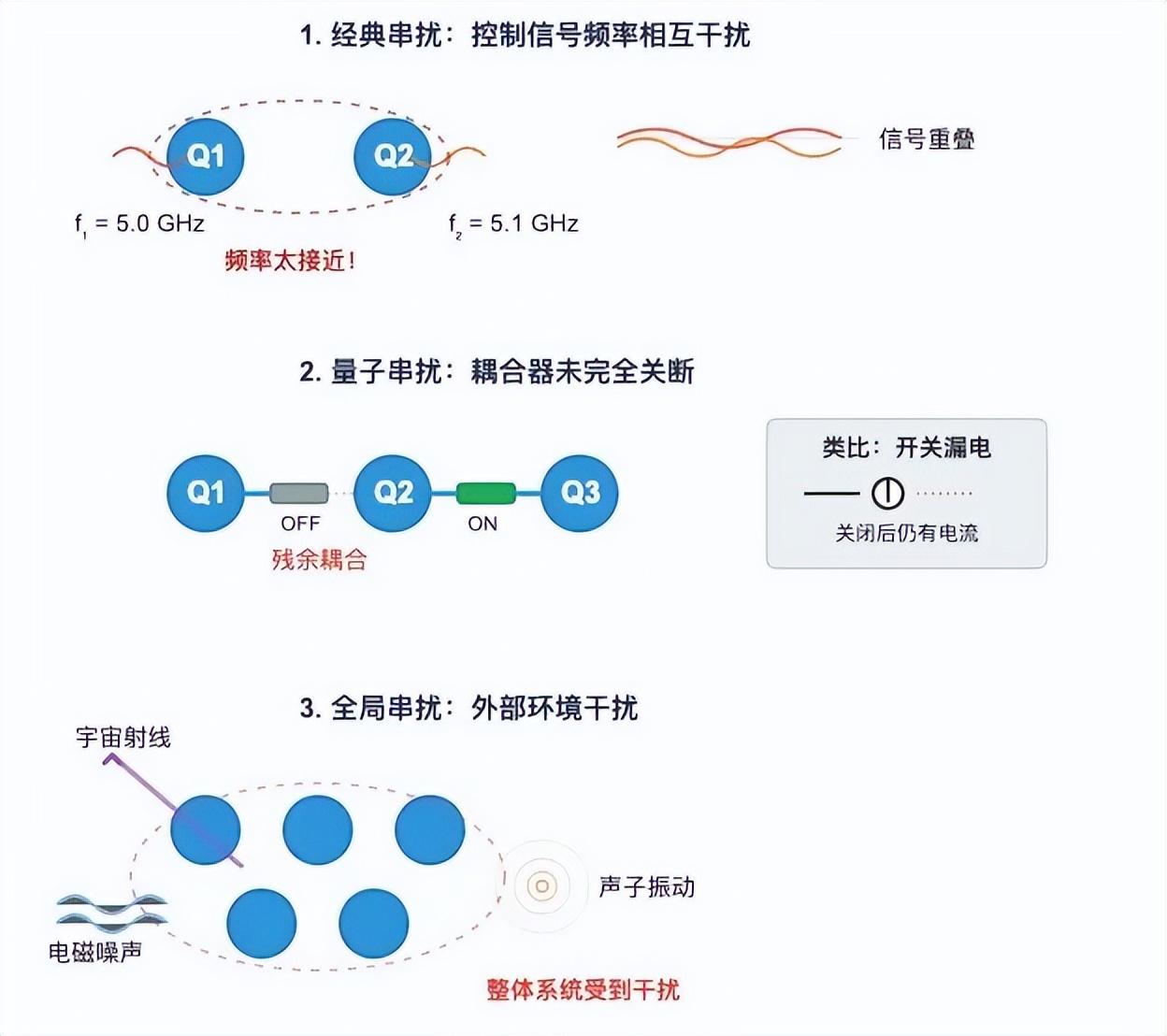 · 經典串擾:量子比特的控制信號的頻率靠的太近,導致控制相互干擾。(頻率指的是波每秒完成的週期數。在量子計算中,每個量子比特通過不同頻率的微波信號進行控制,從而實現精確的操作和調控)