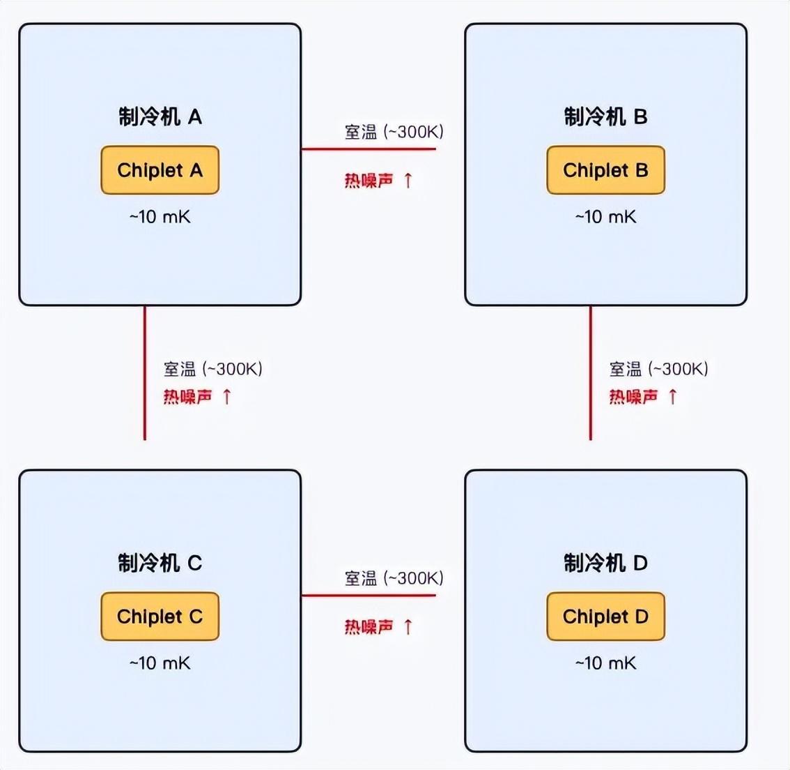這種“低溫 ↔ 室溫 ↔ 低溫”的信號傳輸路徑會引入較大的熱負載和噪聲,從而破壞量子比特的狀態。如果所有 Chiplet 都放在同一臺稀釋製冷機裏,那我們就需要一臺功率極其龐大的稀釋製冷機來容納數千個 Chiplet,而製造這樣的大規模稀釋製冷機本身就是全新的挑戰。