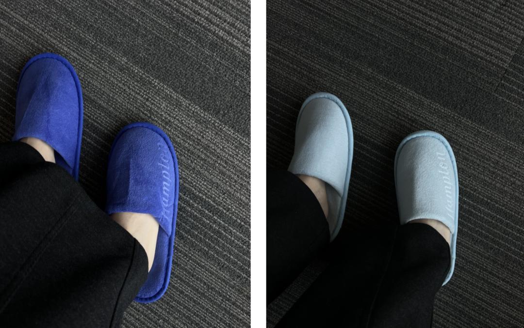 除了材質和質感外,希爾頓歡朋的酒店拖鞋甚至還捲起了顏值,分爲克萊因藍和薄荷綠兩款,也爲潛在的顧客提供了更多入住的理由。