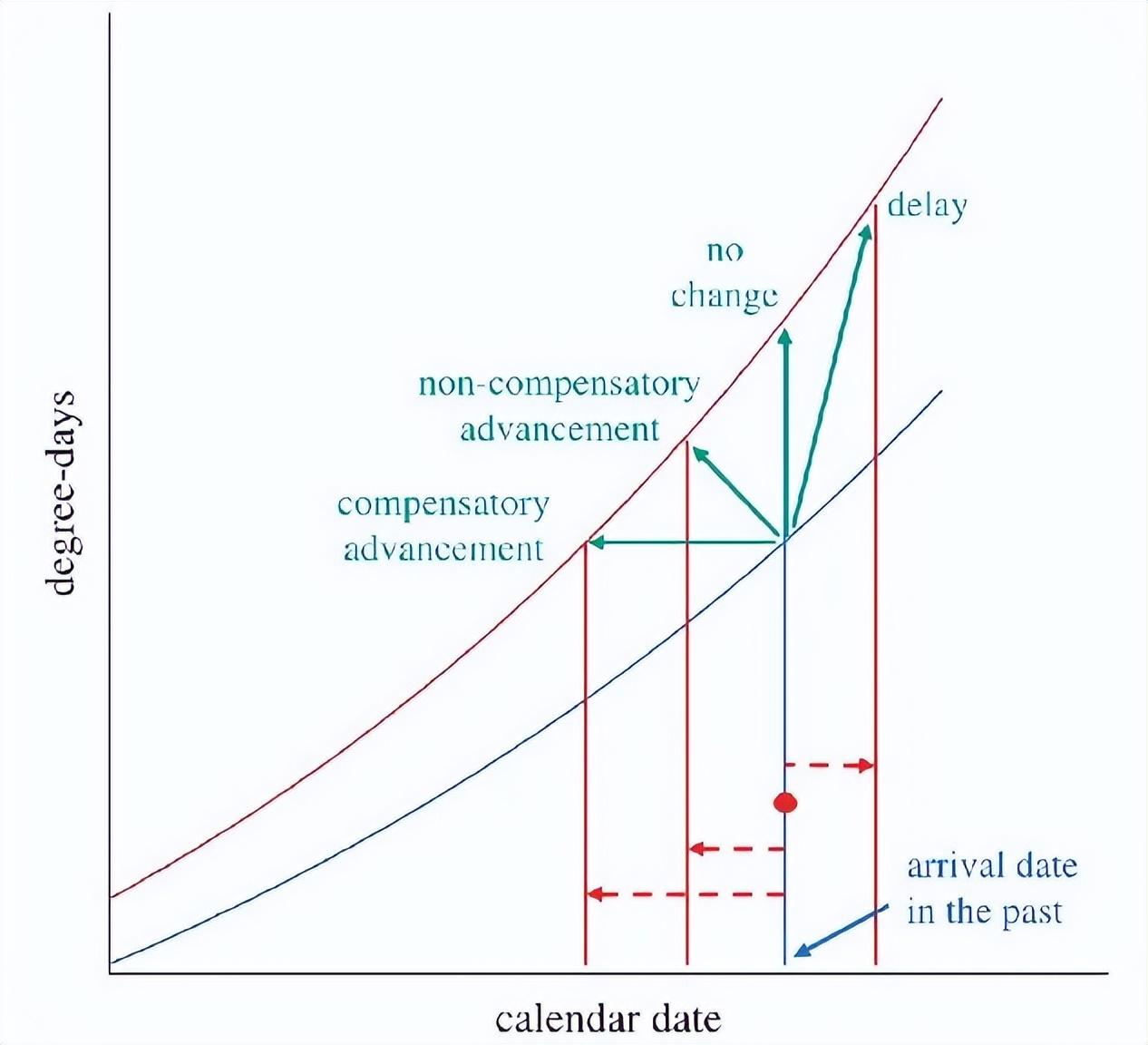 相對氣候和物候變化對候鳥生態錯配的潛在影響。候鳥只有大幅提前到達日期才能完全彌補氣候變化帶來的影響(Saino et al. 2010)。
