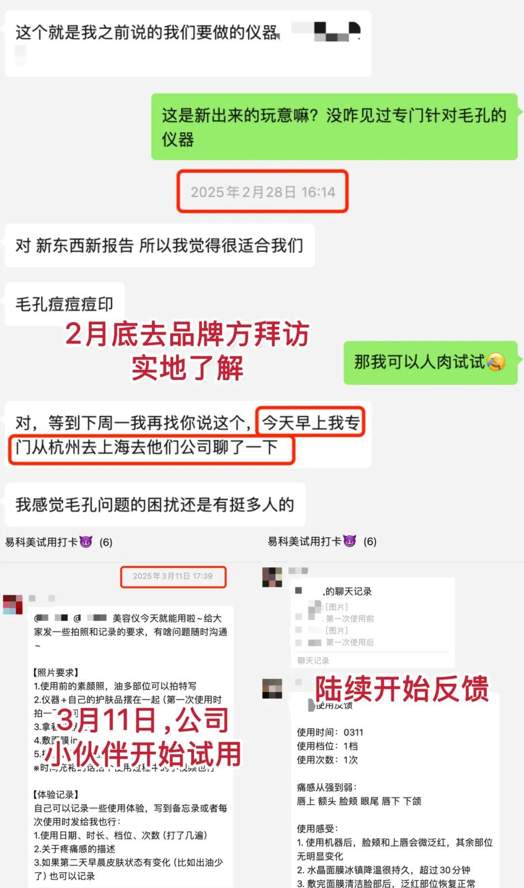 ✅ 去年底,買手自己當小白鼠測試被種草;✅ 今年2月底去品牌方實地探訪;✅ 3月初,我人肉測試初步OK,同步在公司徵集試用小夥伴;✅ 3月11日,小夥伴們陸續開始上臉實測;✅ 3月12~4月6日,小夥伴定期打卡反饋,一致好評。