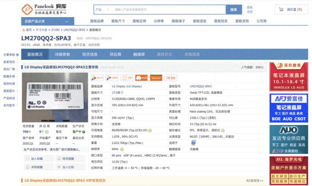 蘋果 Studio Display,5K 分辨率、最高 600 尼特亮度、P3 廣色域、售價上萬。而此前 iMac 5K 使用的面板 LG LM270QQ2,和 Studio Display 參數高度一致,只是亮度略低一點,在閒魚單買只需要不到 2000 元。