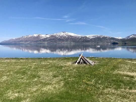 2025年5月17日,阿克雷裏鎮附近的埃亞峽灣平靜的海面。這裏有100多年的溫度測量記錄,今年5月前22天的平均氣溫爲 10.9°C,是該時期有記錄以來的最熱值|Haukur Haraldsson / Icelandic Met Office