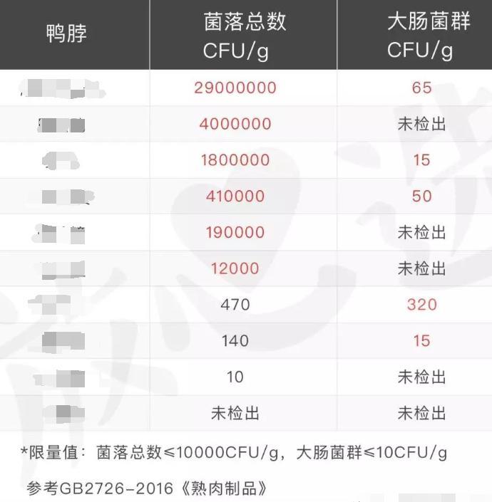 鴨脖屬於高蛋白熟食製品,極易滋生細菌。近幾年第三方測評機構多次檢測出鴨脖菌落總數、大腸菌羣超標。