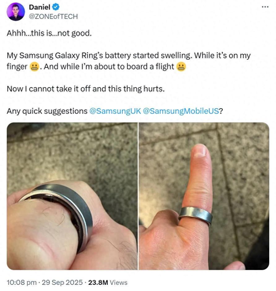 Daniel Rotar隨即發佈了一條推特,“我的三星Galaxy Ring電池開始膨脹。它正戴在我的手指上。”照片裏,他的手指已經因爲充血而腫脹發紅。這條推特很快獲得了2000多萬的瀏覽量,不少人反映自己也在佩戴三星智能戒指時遭遇過類似的問題。